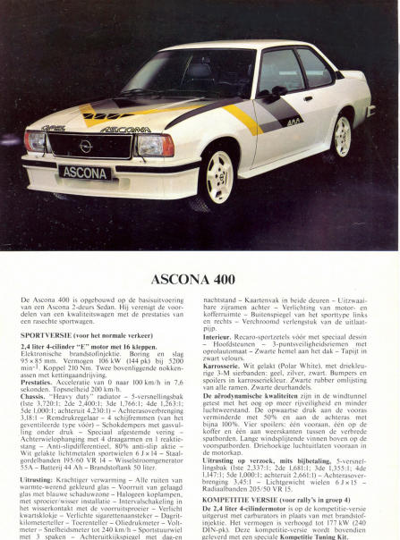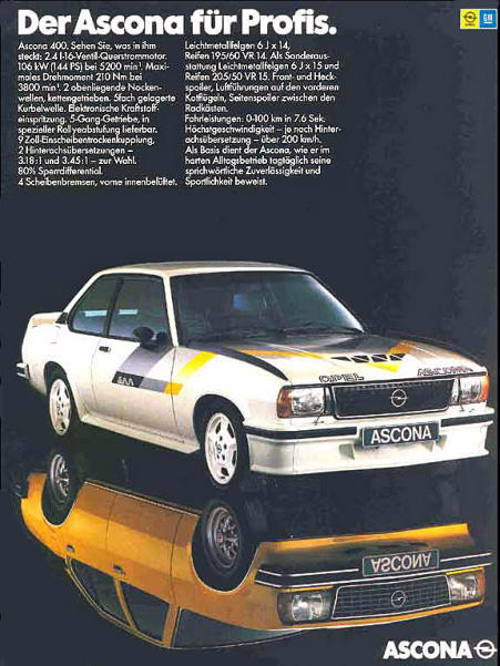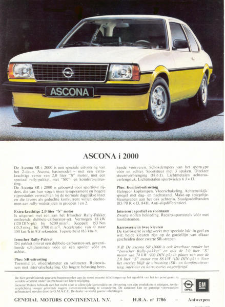 The second generation Opel Ascona B was presented in the 1975 Frankfurt Motor Show. It was available as a two or four-door sedan. There were related two and three-door coupé models in the Opel Manta range. There was no estate body. The Ascona B retained the same engine range as its predecessor, although the 1.9 L was increased to 2.0 L in 1978, and versions with higher compression ratio and needing 98 octane gas, dubbed S, were available alongside the 90 octane models. The 2.0 E model had a Bosch L-Jetronic electronic fuel injection, and a 2.0 L diesel motor was added to the Ascona B range in 1978. Engine range was larger than that of the Vauxhall Cavalier though not all engines were available in the UK. Over 1.2 million Ascona B units were produced worldwide until 1981.i2000 and 400.The Opel Ascona B i2000 and Ascona B 400 are Rally Homologation Specials. Please see the Motor Sport section for further information.