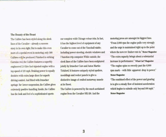 ThelastCavalierMk2tobeproducedwastheCavalierCalibre.BasedontheSRi130withstylingfromAstonMartin/Tickfordandthebodykit,sportssuspensionandexhaustbeingproducedbyIrmscher,itwasalimitedproductionrunofonly500cars.Theideaofthe CalibrecameduringtherunoutoftheCavalierMk2.Vauxhall/OpelhadsurplusSaloonbodyshellswhichtheyhadtomove.IrmscherUKwereinvolvedwithfittingalongwithTickfordthecarcamewithaveryhighspecificationincludingatripcomputer,recaroseats, powerwindowsandpowersteering.Itcostaround£13,000whenreleasedin1987.ThismodeldifferedslightlyinGermanywhereitwassoldastheAsconaSprint.ThedifferenceswherethatitcamewithanIrmscherSteeringwheel,whereasintheUKtheCalibre hadthestandardCavalierwheel.TheseatswereRallyTwillwhereastheCalibrehadChicagovelourtrim.AnditwasalsoavailableinPolarWhiteandAstroSilveralongwiththeCarmineRed.TheCalibrewasjustavailableinCarmineRed.Therewerealsolight differencesinenginesinGermanyastheSprintstartedwiththe20NEthenwenttotheC20NEand20SEH.TocauseevenmoreconfusionthecarwasalsoavailableinSwitzerlandwhereitwasnotbadgedSprintbuti200,thereasonforthiswasthatamodelusingthe Sprintnamewasalreadyonsale.ThespecificationandcolourswerethesameastheSprintbutthei200hadthefollowingadditionsFogHeadlights,heightadjustabilityonthedriver’sseat,the2.0i(C20NE)enginehadacatalyticconverterandtintedglass.Thereare believed to be 1399 Ascona Sprints produced and 879 Ascona i200’.