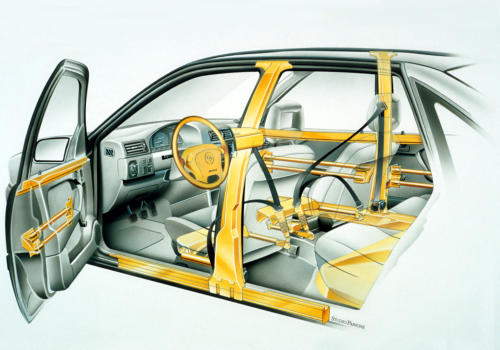 like Air Bags, seatbelt pretensions and door beams were also incorporated. ABS also became standard, the Cavalier Mk3 being the first car in its class to have these as standard fitments. The range was replaced in