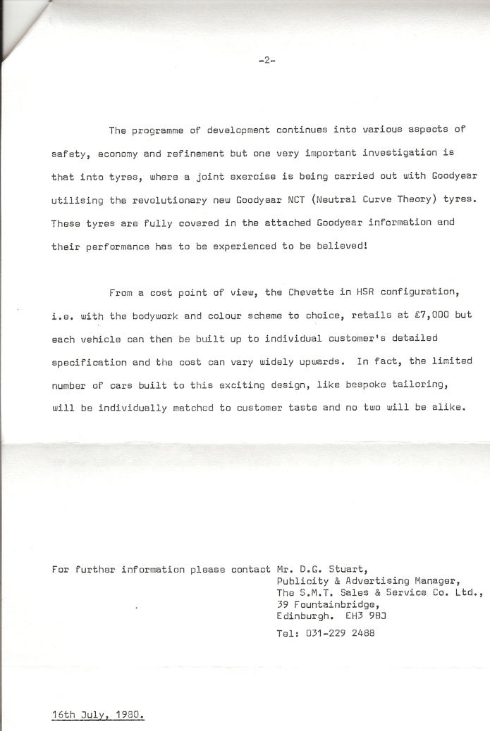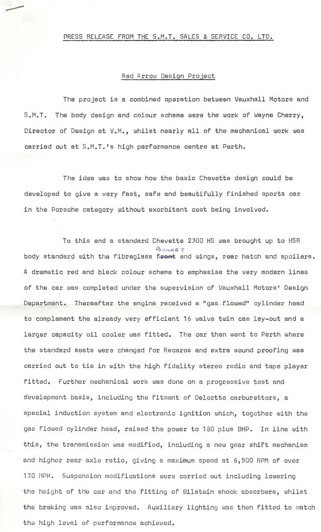 SMT Red Arrow Vauxhall Chevette HSR. Please see letter below for information on this model from SMT Vauxhall Dealers of Scotland.